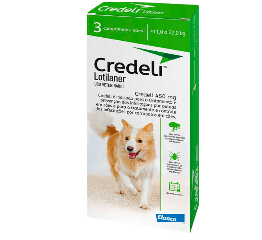 Credeli Verde 11 a 22 Kg é um comprimido mastigável, pequeno e saboroso , que atua rapidamente para proteger cães filhotes e adultos contra carrapatos e pulgas. Credeli é o único que combate o carrapato-estrela, transmissor da febre maculosa. O efeito antipulgas do Credeli dura 1 mês. Tem uma rápida ação contra pulgas e carrapatos, eliminando 100% deles em até 8 horas.