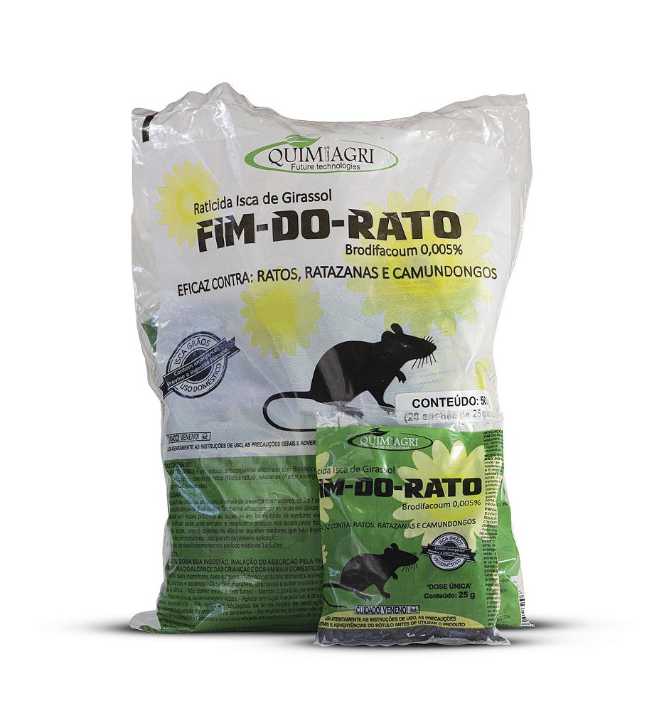 FIM DO RATO Girassol é um raticida anticoagulante elaborado com Brodifacoum, de pronto uso, eficaz no controle de ratos (Rattus rattus), ratazanas (Rattus novergicus) e Camundongos (Mus musculus).