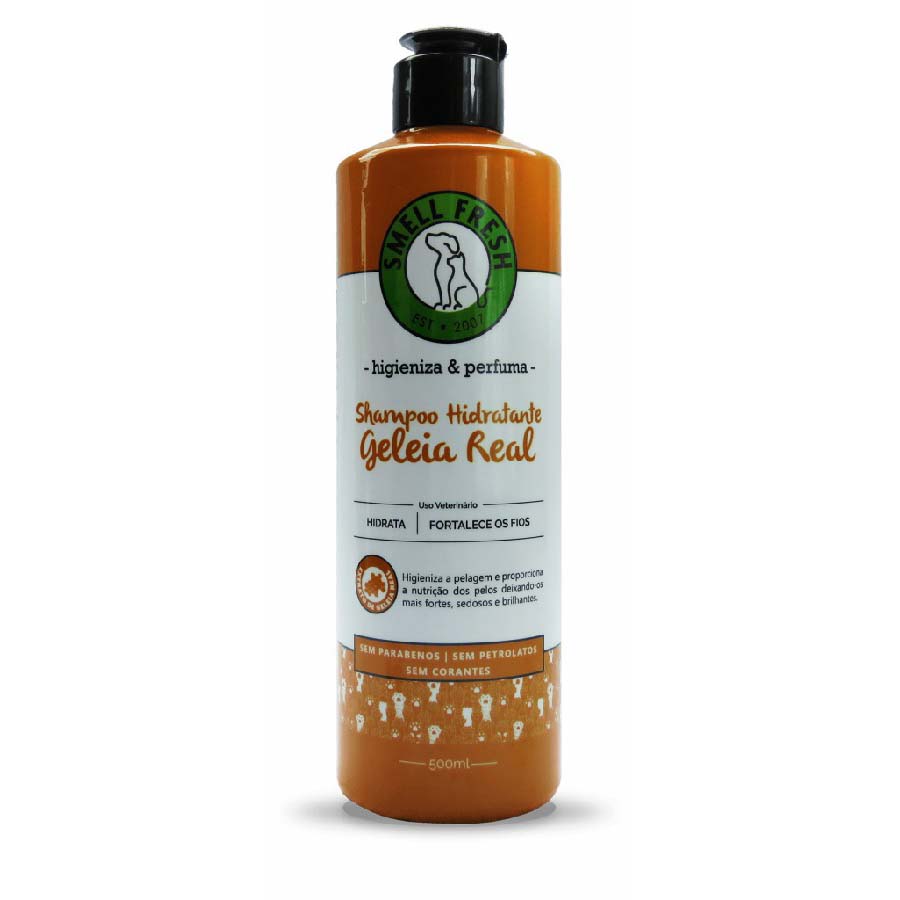 O Smell Fresh Shampoo Hidratante Geleia Real 500 mL é um produto de higiene e embelezamento desenvolvido especialmente cães e gatos, que limpa, hidrata e perfuma a pelagem, proporcionando pelos mais macios, brilhantes e saudáveis. Sua fórmula contém Geleia Real, um ingrediente natural que limpa, nutre e regenera os pelos do seu pet, reduzindo a quebra dos pelos causada por fatores externos que ressecam os fios. É um produto dermatologicamente testado, que respeita o pH da pele e não causam irritações ou alergias.